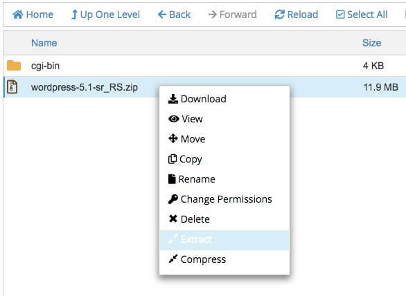 Uradili smo upload WordPress fajlova koji su zapakovani u .zip paketu. Hajde da ih raspakujemo. Kliknite desnim klikom na WordPress zip paket i odaberite opciju Extract: