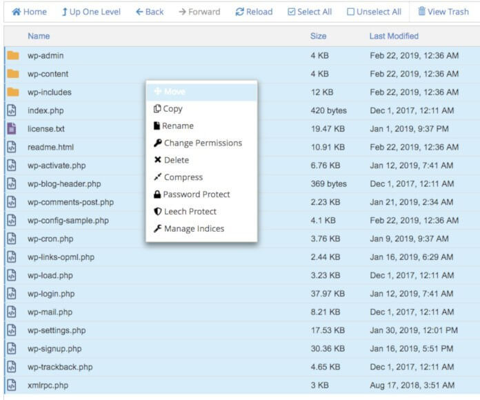 Uđite sada u folder wordpress i odaberite sve fajlove. Sve fajlove birate odjednom tako što kliknete na dugme Select all, a kada su svi fajlovi odabrani kliknite desnim klikom na bilo koji odabrani fajl i odaberite opciju Move: