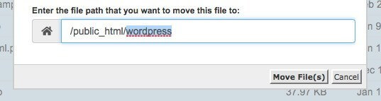 U prozoru koji se otvori, cPanel će vas pitati gde želite da prebacite odabrane fajlove i tu već stoji lokacija gde ste sada. Samo obrišite deo „wordpress“ i kliknite na Move File(s). Ovo će prebaciti fajlove u /public_html folder što će za posledicu imati da sajt radi direktno na domenu vaš-domen.rs umesto na vaš-domen.rs/wordpress.