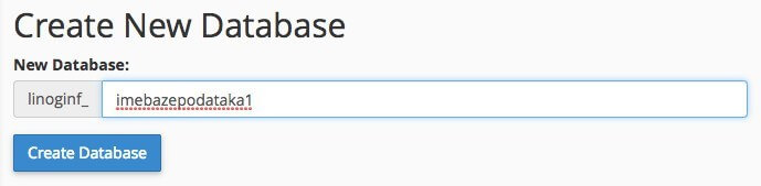 U cPanelu potražite aplikaciju MySQL Databases. Kada je otvorite, prva opcija je Create New Database. Potrebno je da unesete ime baze podataka po želji. Prefiks ne možete menjati i uvek nosi naziv korisnika cPanela. Kada unesete naziv koji želite kliknite na Create Database i sačuvajte ovaj naziv negde sa strane (kopirajte celi naziv, primer linoginf_imebazepodataka1).