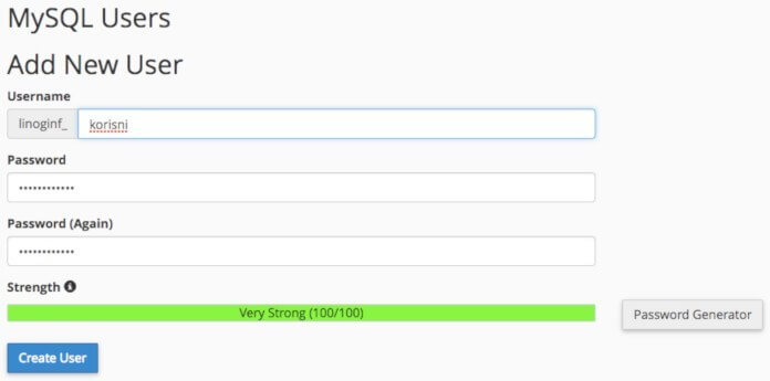 Videćete deo MySQL Users Add New User. U polje Username unesite korisničko ime za korisnika baze po želji. U polja Password i Password (again) unesite lozinku za tog korisnika. Možete koristiti i Generator lozinki, a tačan naziv korisnika i lozinku zapišite sebi negde sa strane, isto kao što ste uraditi i sa bazom podataka. Da kreirate korisnika kliknite na Create User dugme: