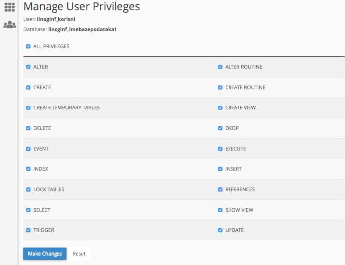Otvoriće se Manage User Privileges stranica. Štiklirajte opciju ALL PRIVILEGES, a zatim kliknite na Make Changes da bi to bilo sačuvano.