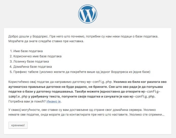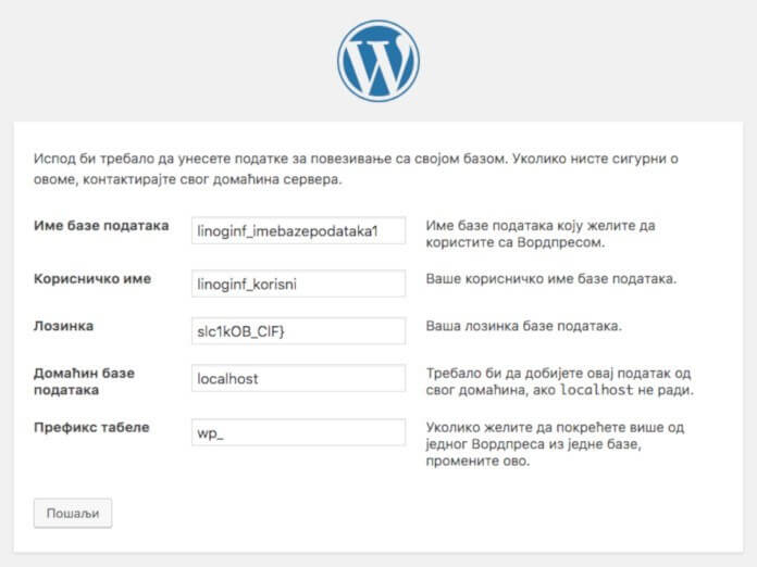 Kliknite na dugme krenimo! kako biste započeli instalaciju WordPressa. Ovde sada unosite parametre baze podataka koje ste malo pre zapisali sa strane. Kada ih unesete kliknite na dugme Pošalji.