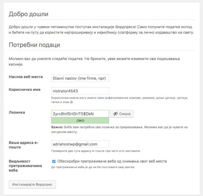 Ovo je bitno sada. Unesite naslov vašeg sajta. Ovo je glavni naslov i dobro je da bude kao naziv vaše firme ili bloga (ako ste bloger, na primer). Korisničko ime će vam trebati za pristup, izbegavajte „admin“ i „administrator“ zbog brute-force napada i pokušaja hakovanja. Stavite složenu lozinku i tačnu email adresu koju pratite i kojoj imate pristup.