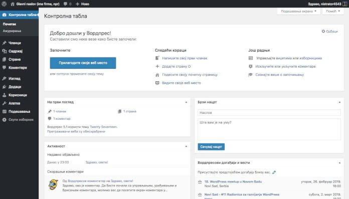Ovako izgleda WordPress kada se ulogujete pa istražite i upoznajte se sa opcijama: