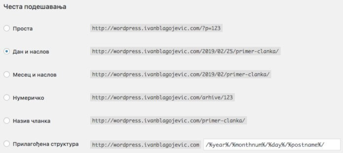 Ovo je važno i nalazi se u Podešavanja – Stalne veze. WordPress podrazumevano gradi linkove kao vaš-sajt.rs/2019/02/25/primer-clanka/. Savetujemo da odaberete opciju Naziv članka kao vrsta linka pa će tada link izgledati ovako vaš-sajt.rs/primer-clanka/. Nikako nemojte birati prvu opciju sa slike ispod jer se pokazalo kao loše za pretraživače.