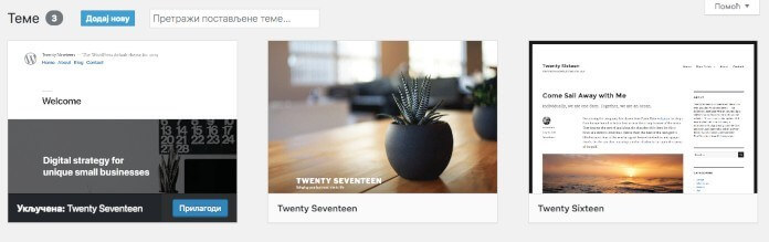 Temu menjate u Izgled – Teme. WordPress dolazi sa par tema podrazumevano i one su prilično minimalne. Ako želite neku drugu temu, možete klikniti na dugme Dodaj novu.