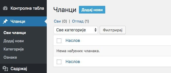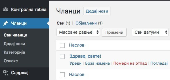 Uz WordPress dolazi i jedan članak kao primer pod naslovom Zdravo svete! Možete ga obrisati jer nije baš profesionalno da se taj članak vidi na vašem sajtu. Obrišite ga u Članci-Svi članci klikom na opciju Pomeri na otpad.