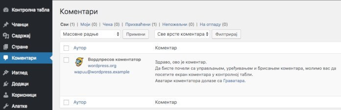 Takođe, dolazi vam i jedan komentar kao primer pod naslovom Zdravo, ovo je komentar. Ovaj komentar će biti obrisan automatski kada obrišete i članak Zdravo svete! a sve nove komentare na nove tekstove možete pratiti u Komentari: