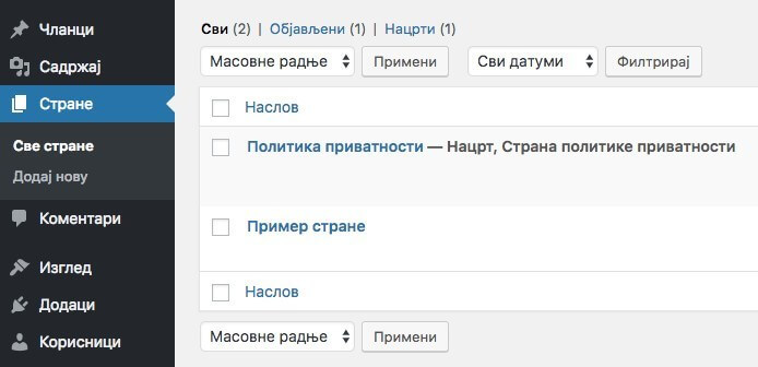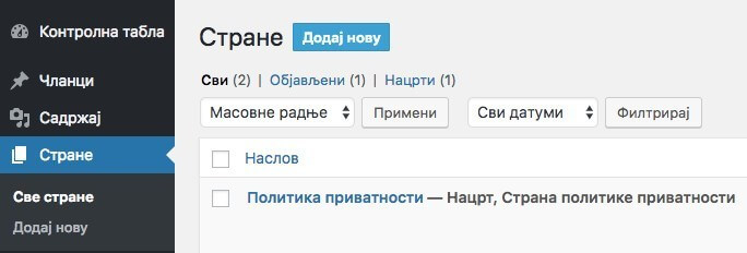 Za neki dobar početak, napravite stranice preko kojih ćete predstaviti ono što nudite ako ste firma, ili o čemu pišete ako ste bloger. Neke osnovne stranice su Početna, Blog, O nama (Autor, O meni), Kontakt. Kasnije možete dodavati nove, a sve to radite u Strane – Sve strane i kliknete na dugme Dodaj novu.