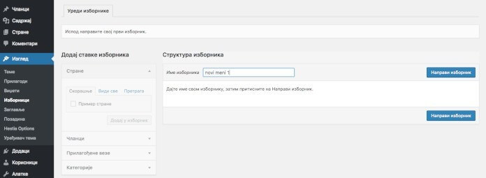 Kada pravite nove stranice i pišete tekstove trebaće vam i meni koji će to prikazati na vašem sajtu radi lakše navigacije posetilaca. Idite u Izgled – Izbornici i u Ime izbornika napišete naziv koji će ovaj meni nositi i kliknite na dugme Napravi izbornik: