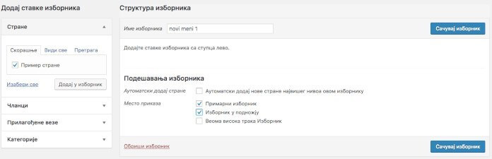 Kada napravite novi izbornik, sa leve strane pod Dodaj stavke izbornika možete dodati stranice koje će se naći u meniju. Samo štiklirajte stranicu koju želite da dodate u meni i kliknite na Dodaj u izbornik. U Podešavanja izbornika štiklirajte gde će taj meni stajati i kliknite na Sačuvaj izbornik da to sve sačuvate.