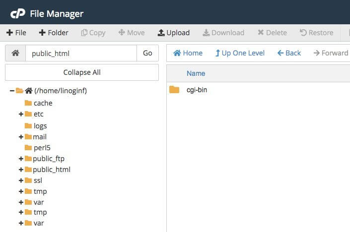 Odmah po otvaranju File manager podrazumevano otvara /home/ime-korisnika lokaciju i ovo nije lokacija gde treba da postavite fajlove WordPressa. Ukoliko je vaš hosting nov i tu podižete prvi sajt, lokacija gde treba da postavite fajlove je /public_html folder pa ga otvorite. Ovaj folder je prazan, odnosno tu je samo cgi-bin folder. Kliknite na dugme Upload: