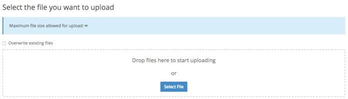 Otvoriće se stranica koja omogućava da sa vašeg računara podignete fajlove na vaš hosting. Kliknite na Select File: