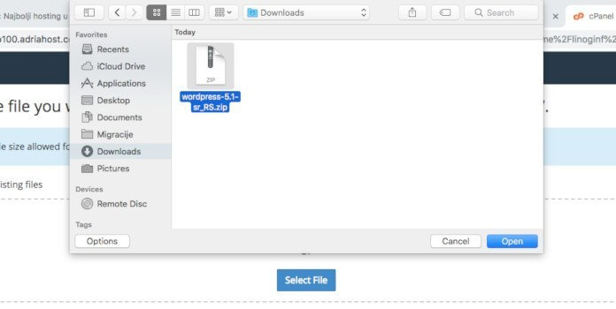 Tada će se otvoriti prozor koji prikazuje foldere i fajlove koji se nalaze na vašem računaru. Ovde odaberite WordPress fajl koji ste malo pre sačuvali na računaru, odaberite ga jednim klikom a zatim i kliknite na Open: